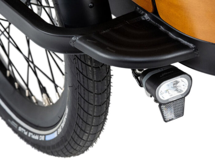 De hardhouten bak kan een gewicht van 80 kilo dragen. De bak is gemonteerd op een stevig stalen frame. Aan weerszijden van de bak zitten de 20 inch voorwielen met spatborden en hydraulische schijfremmen met parkeerrem, die via een drukknop op de remhendels is te activeren. Het achterframe van deze bakfiets is van aluminium. Het 26 inch achterwiel is voorzien van een uiterst betrouwbare, soepel schakelende Nuvinci 330 traploze versnellingsnaaf (met een schakelbereik vergelijkbaar met een 7 versnellingsnaaf) een hydraulische schijfrem en een spatbord. De berijder en eventuele bagage die op de bagagedrager wordt meegenomen mogen in totaal 120 kilo wegen, waardoor deze bakfiets een maximale belasting van 250 kilo aankan.