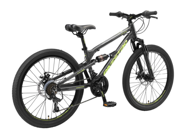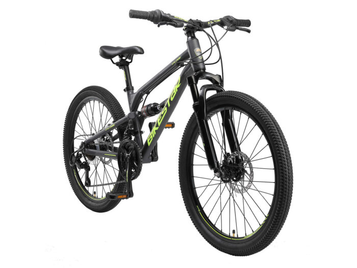 **Full suspension mountainbike** Zeer stabiel aluminium frame voor dagelijks gebruik op de berg, in de stad of op school. Met een bandenmaat van 24 inch en framemaat 13 inch is hij geschikt voor jongens of meisjes, vanaf ca. 140cm. Met het 21-speed Shimano derailleur-systeem met bijna naadloze schakeling kun je elke situatie aan. De bijzonder gripvaste schijfremmen aan de voor- en achterkant zorgen voor de nodige controle. De fiets heeft een geveerde voorvork met 55 mm veerweg en een geveerde achterbrug.