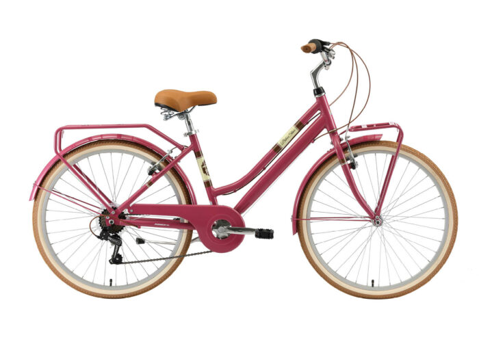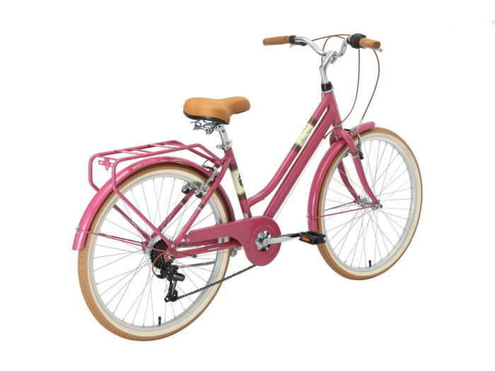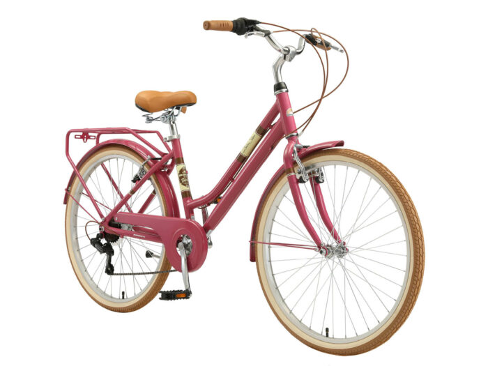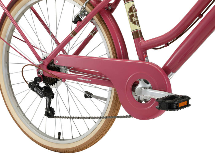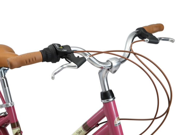 **Een retro damesfiets** Deze fiets is geschikt voor mensen vanaf lengte van 150 tot zo’n 170cm. Zadel en stuur zijn in hoogte te verstellen, waardoor een fijne zithouding voor vrijwel iedereen kan worden ingesteld. Deze fiets met een framehoogte van 41 cm heeft een 7 versnellingen derailleur met draaigreep schakelaar.