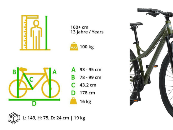 Aluminium hardtail MTB, 27,5 inch wielen, 21 versnellingen, schijfremmen.