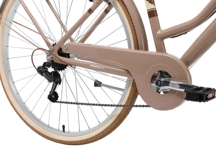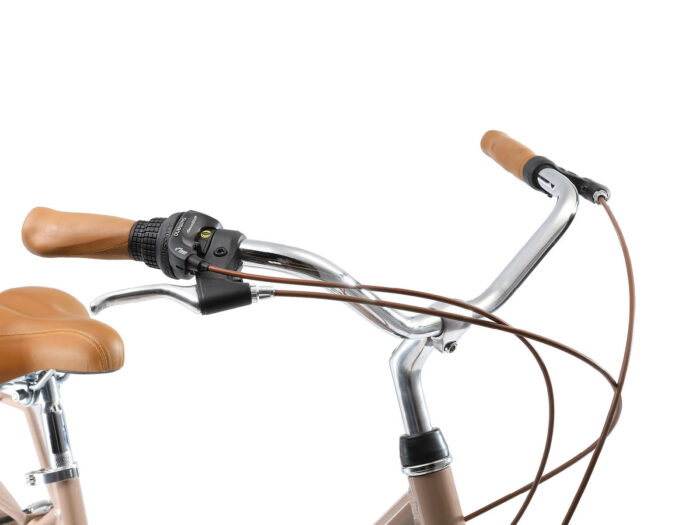 **Een retro damesfiets** Deze fiets is geschikt voor mensen vanaf lengte van 170cm. Zadel en stuur zijn in hoogte te verstellen, waardoor een fijne zithouding voor vrijwel iedereen kan worden ingesteld. Deze fiets met een framehoogte van 46 cm heeft een 7 versnellingen derailleur met draaigreep schakelaar.