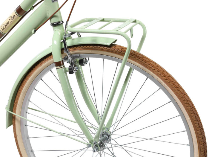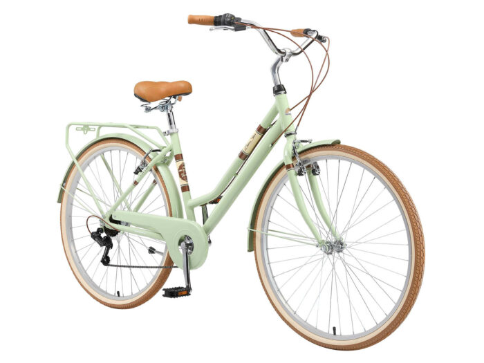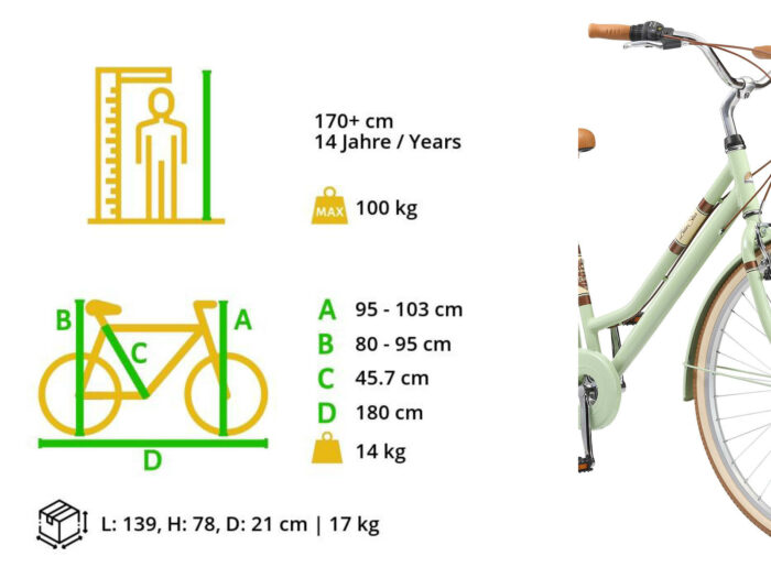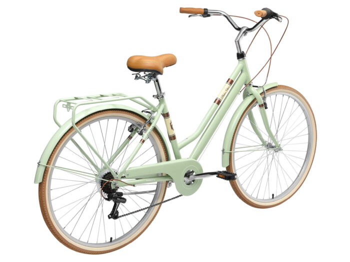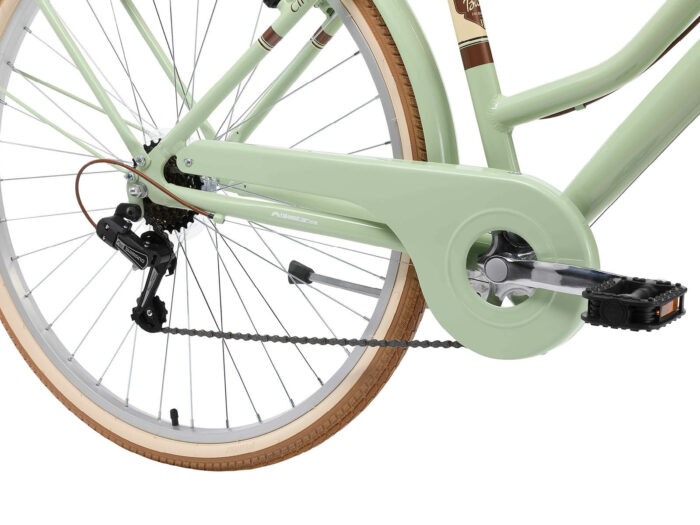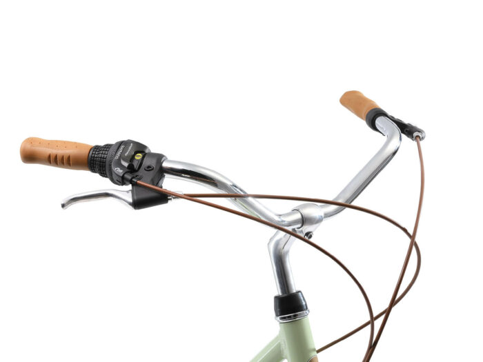**Een retro damesfiets** Deze fiets is geschikt voor mensen vanaf lengte van 170cm. Zadel en stuur zijn in hoogte te verstellen, waardoor een fijne zithouding voor vrijwel iedereen kan worden ingesteld. Deze fiets met een framehoogte van 46 cm heeft een 7 versnellingen derailleur met draaigreep schakelaar.