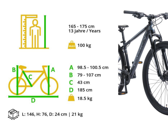 MTB met 21 versnellingen, 29 inch wielen, schijfremmen en geveerde voorvork met 90 mm veerweg