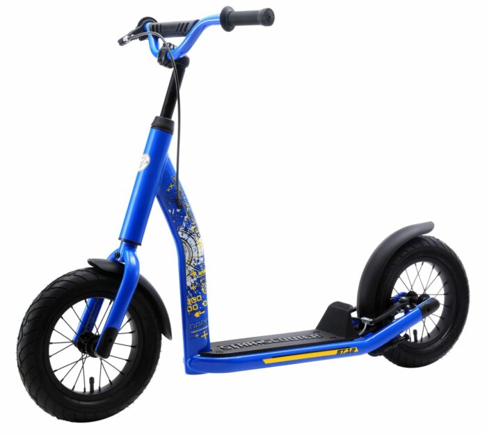 Sterke step met 12 inch luchtbanden, verstelbaar stuur, handrem op achterwiel en antislip voetbord. Vanaf 7 jaar.