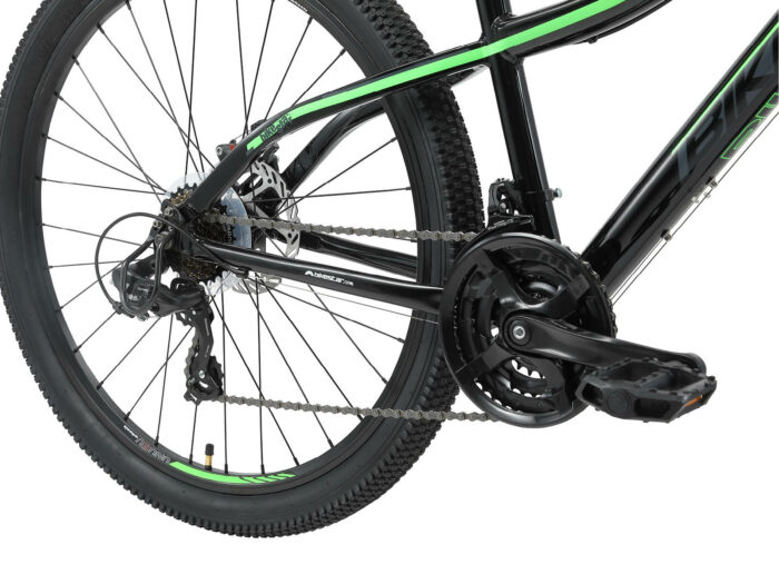 **Prima mountainbike** Zeer stabiel aluminium frame voor dagelijks gebruik op de berg, in de stad of op school. Met een bandenmaat van 27,5 inch en framemaat 17 inch is hij geschikt voor jongens, meisjes of volwassenen van ca. 165 tot 175cm. Met het 21-speed Shimano derailleur-systeem met bijna naadloze schakeling kun je elke situatie aan. Mechanische schijfremmen aan de voor- en achterkant zorgen voor de nodige controle. De fiets heeft een geveerde voorvork met 55 mm veerweg.