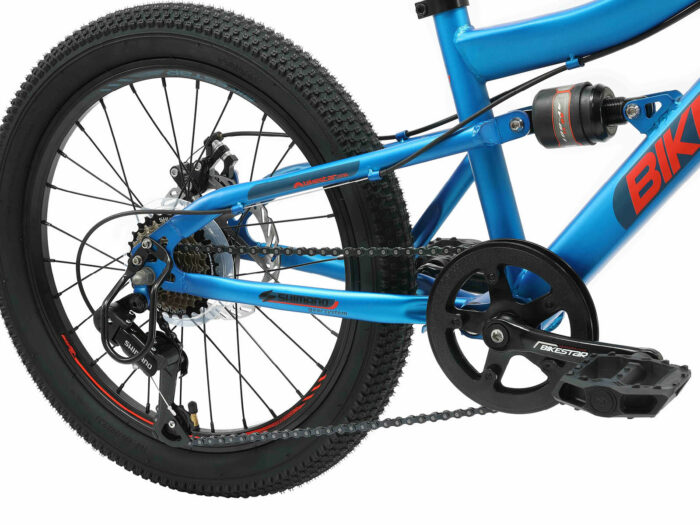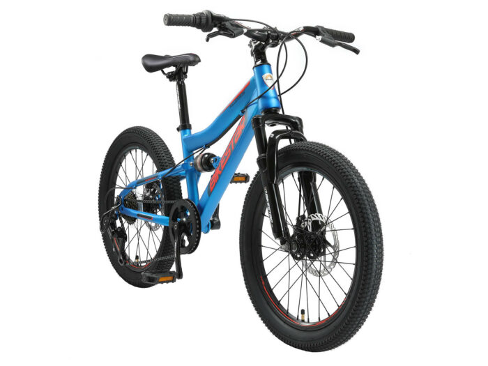 **Een veilige mountainbike** Zeer stevig stalen frame voor dagelijks gebruik op de berg, in de stad of op school. Zeer comfortabel dankzij de voor- en achtervering. Met een bandenmaat van 20 inch en framemaat 11 inch is hij geschikt voor jongens of meisjes, vanaf ca. 114cm. Met het 7-speed Shimano derailleur-systeem met bijna naadloze schakeling kun je elke situatie aan. De schijfremmen aan de voor- en achterkant zorgen voor prima remprestaties.