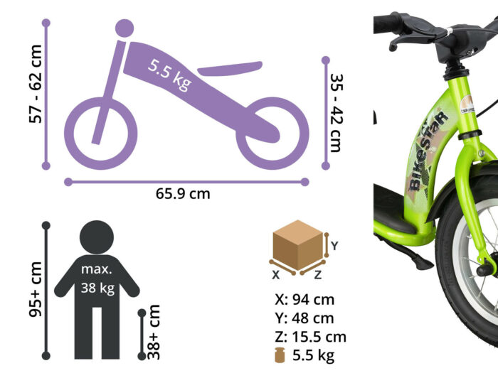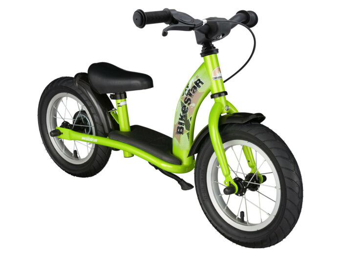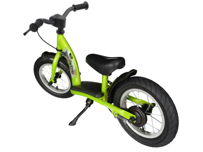Stabiele loopfiets met 12 inch luchtbanden op spaakwielen, met staplank, verstelbaar zadel, standaard en achterwiel rem. Vanaf 3 jaar.
