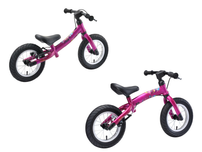 Meegroei loopfiets, omdraaibaar frame, in hoogte verstelbaar zadel, 12 inch luchtbanden op spaakwielen, handrem. Vanaf 3 jaar.