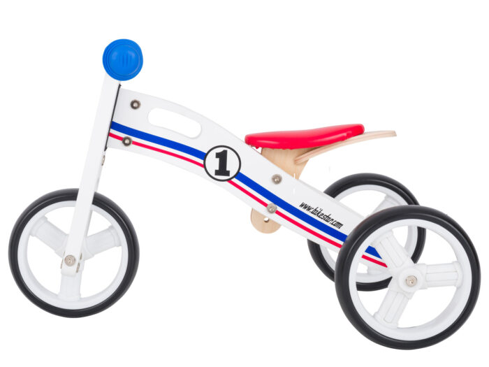 Houten mini driewieler, eenvoudig om te bouwen tot tweewieler loopfiets met 7 inch wielen voor de jongste lopers vanaf circa 18 maanden.
