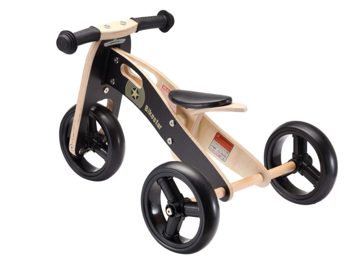 Zeer stabiel houten frame met slagvaste verf op waterbasis en in hoogte verstelbaar zadel. Begin als driewieler, bouw om naar tweewieler.