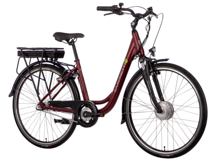 Elektrische damesfiets met 3 versnellingen Shimano naaf en voorwielmotor. 10.4 Ah accu op de achterdrager, LED display, 3 ondersteuningsstanden, V-brakes en terugtraprem.