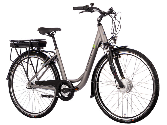 Elektrische damesfiets met 3 versnellingen Shimano naaf en voorwielmotor. 10.4 Ah accu op de achterdrager, LED display, 3 ondersteuningsstanden, V-brakes en terugtraprem.