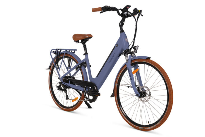 Elektrische damesfiets Beaufort Britt met achterwielmotor, 7 versnellingen derailleur, geintegreerde accu en schijfremmen.