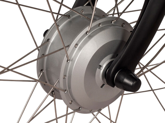 **Deze elektrische damesfiets heeft een elegant aluminium frame met lage instap en een krachtige 13 Ah accu die de voorwielmotor van stroom voorziet.**
