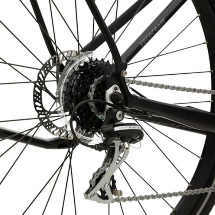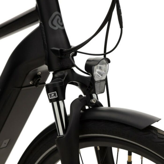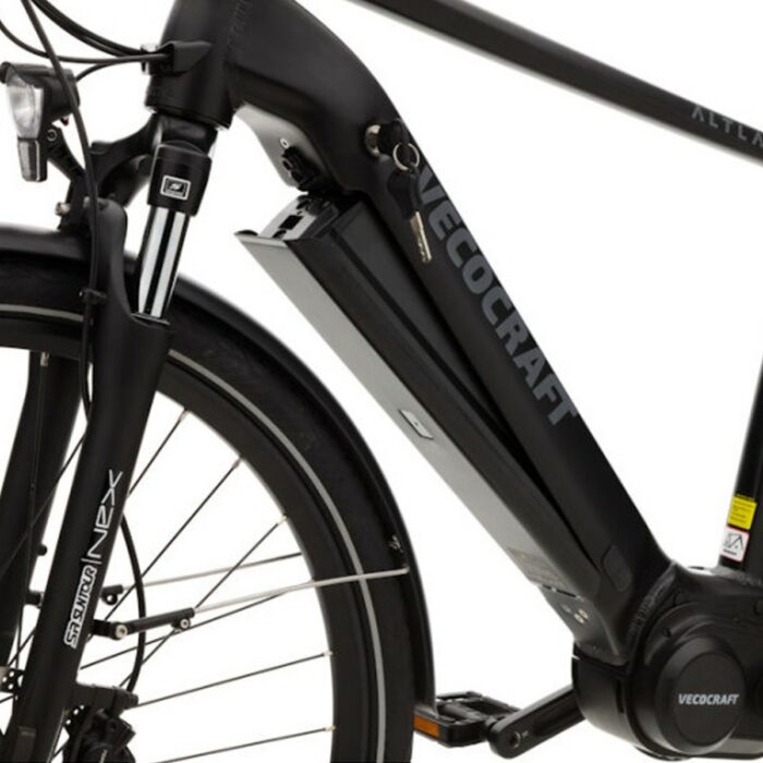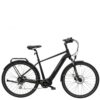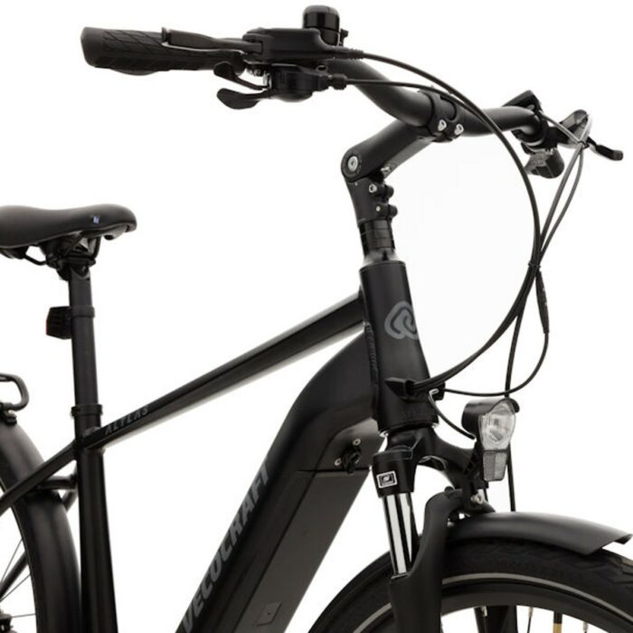 Elektrische herenfiets met middenmotor, geïntegreerde accu, schijfremmen en 8 versnellingen derailleur. Luxe uitgevoerde trekkingfiets. Aluminium, zwart.