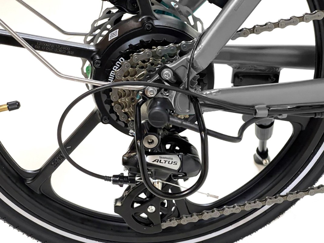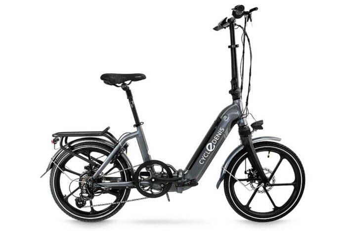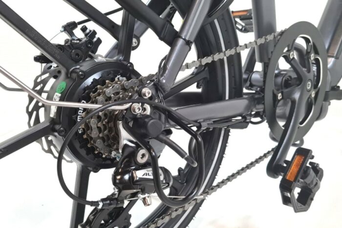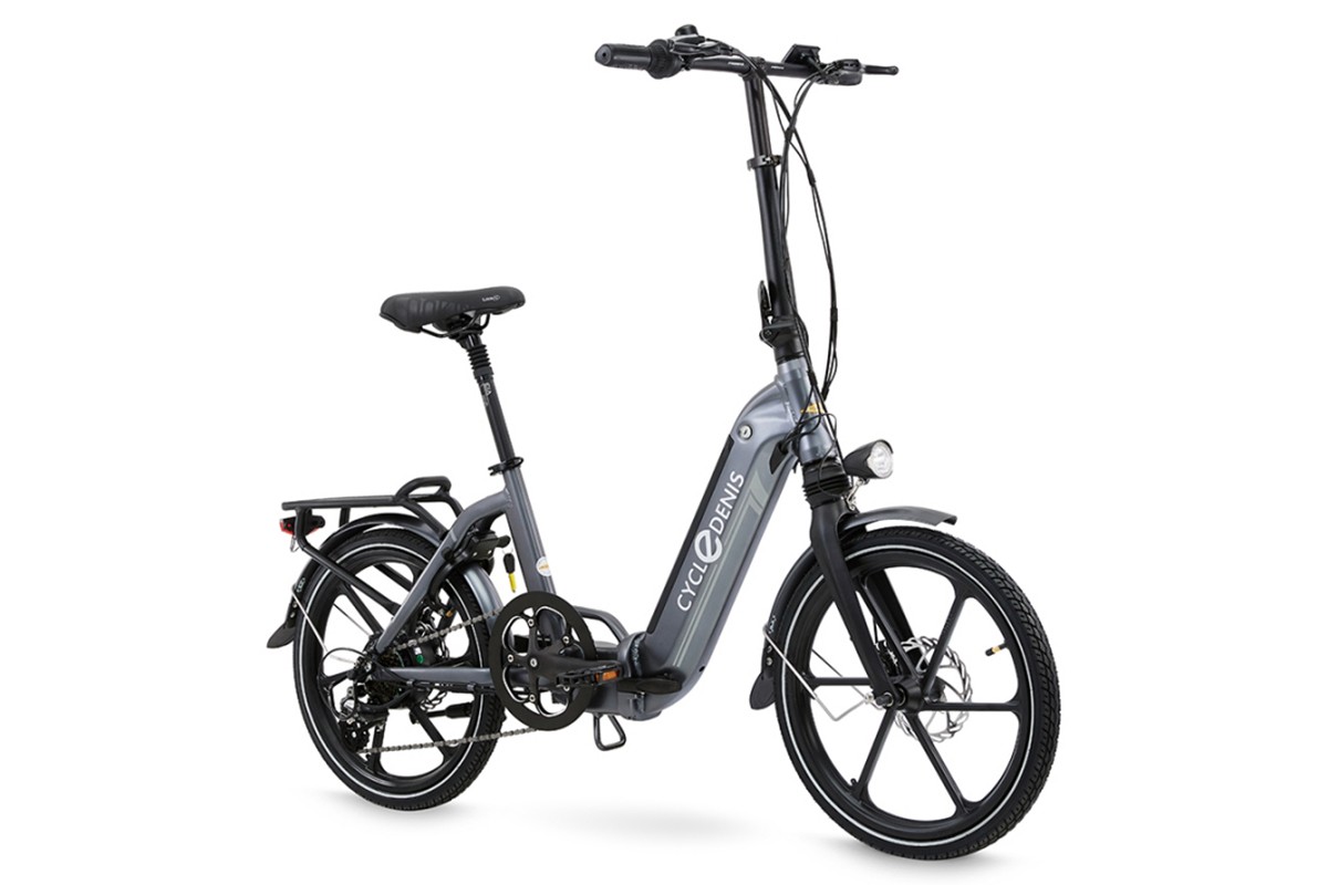 Elektrische vouwfiets met achterwielmotor, geïntegreerde accu, schijfremmen, 14 Ah accu. Aluminium, grijs. Fijne luxe vouwfiets met volwassen uitstraling.