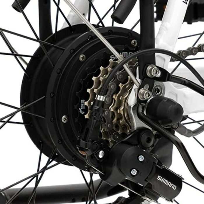 De kleur van het frame is wit. De actieradius bedraagt circa 80 kilometer, doordat er een 13 Ah accu achter de zadelbuis is gemonteerd. Ingeklapt is de afmeting ca 85 x 38 x 71 cm, uitgevouwen ca 179 x 63 x 115 cm.