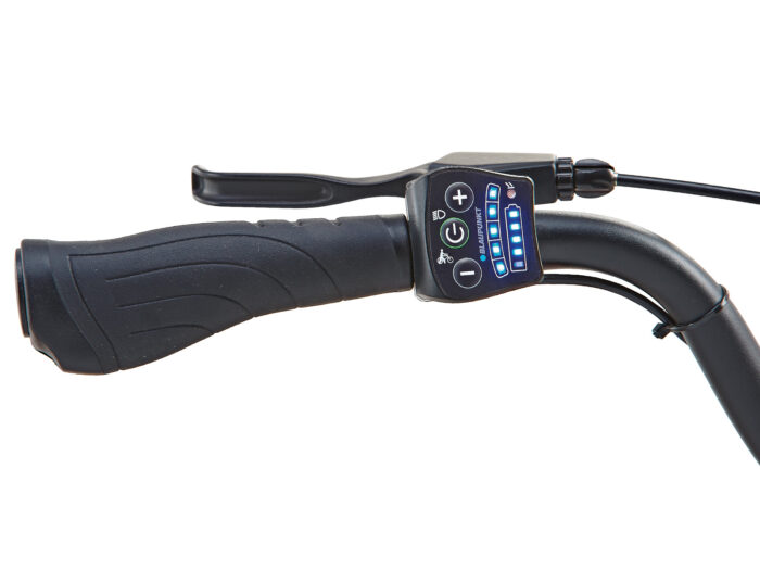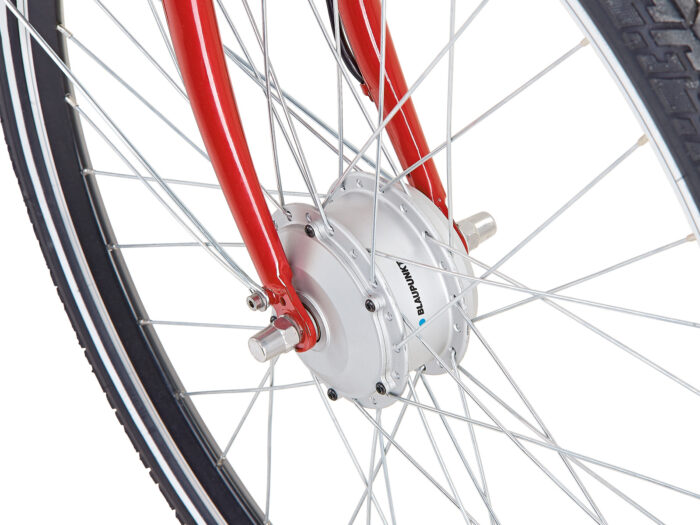 Doordat de 11.6 Ah accu van deze e-bike half is geïntegreerd in de topbuis van dit roodgespoten aluminium damesframe, heeft deze fiets een sportieve uitstraling, als van een trekkingfiets. De achternaaf is echter voorzien van de betrouwbare Shimano Nexus 3 versnellingsnaaf, in plaats van een derailleur. Dit maakt de fiets minder geschikt voor toertochten in heuvelachtig terrein, maar wel zeer prettig in gebruik in de stad of als woon-werk of schoolfiets. De Blaupunkt voorwielmotor met 40 Nm trekkracht sleept u door weer en wind. Al naar gelang de omstandigheden en met name indien u stevig meetrapt, is een actieradius tot 120 kilometer mogelijk. Maar ook als u de motor al het werk laat doen zult u voor de meeste ritten met deze fiets prima vooruit kunnen. Bediening van het elektrische gedeelte gaat via het LED display, ook de verlichting bedient u hiermee. De fiets is voorzien van Promax mechanische velgenremmen.