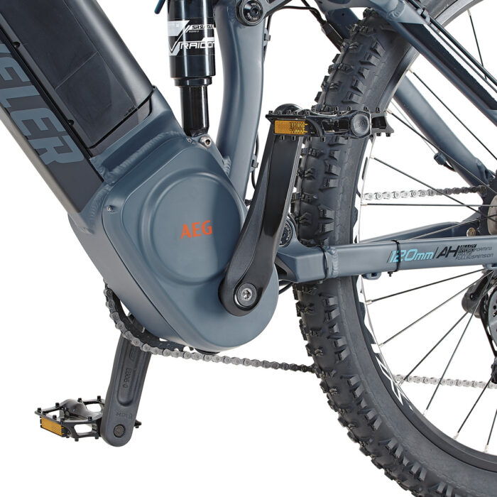 De krachtige 48 volt AEG SportDrive middenmotor is met zijn vermogen van 250 watt en zijn maximum koppel van 100 Nm voorbestemd voor sportieve ritten op veeleisend terrein. Een versnellingssensor meet cadans en snelheid en zorgt voor de juiste trapondersteuning. Er zijn in totaal vijf niveaus beschikbaar, die je kunt bijhouden op het multifunctionele AEG LCD-display, net zoals snelheid of batterijlading. Hij wordt bediend via een aparte bedieningsunit op het stuur, zodat je handen veilig aan het extra grote stuur blijven tijdens het rijden. Handig is de USB-oplaadmogelijkheid voor je smartphone. De proKey-functie biedt extra diefstalbeveiliging, waarmee alleen jij, de eigenaar van de bijbehorende chip, de elektronische startonderbreker kunt ontgrendelen en tegelijkertijd de E-MTB kunt inschakelen.