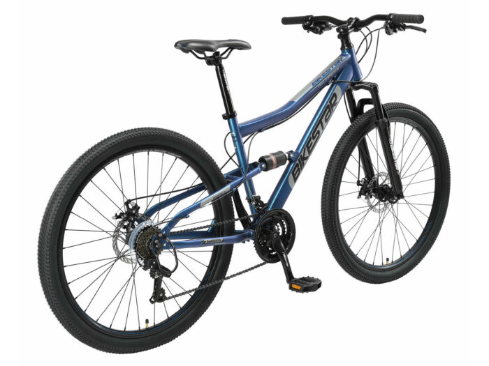 **Fully mountainbike** Zeer stabiel stalen frame voor dagelijks gebruik op de berg, in de stad of op school. Met een bandenmaat van 27,5 inch en framemaat 17 inch is hij geschikt voor jongens, meisjes of volwassenen vanaf ca 160cm. Met het 21-speed Shimano derailleur-systeem met bijna naadloze schakeling kun je elke situatie aan. Mechanische schijfremmen aan de voor- en achterkant zorgen voor de nodige controle. De fiets heeft een geveerde voorvork met 55 mm veerweg en een geveerde achterbrug.