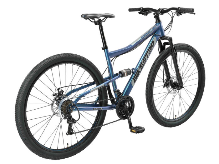 **Fully mountainbike** Zeer stabiel stalen frame voor dagelijks gebruik op de berg, in de stad of op school. Met een bandenmaat van 295 inch en framemaat 19 inch is hij geschikt voor jongens, meisjes of volwassenen vanaf ca 175cm. Met het 21-speed Shimano derailleur-systeem met bijna naadloze schakeling kun je elke situatie aan. Mechanische schijfremmen aan de voor- en achterkant zorgen voor de nodige controle. De fiets heeft een geveerde voorvork met 55 mm veerweg en een geveerde achterbrug.