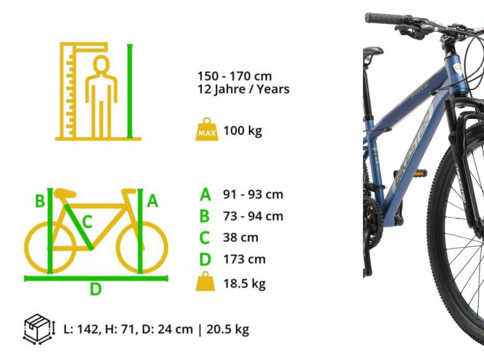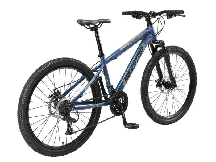 **Prima mountainbike** Zeer stabiel stalen frame voor dagelijks gebruik op de berg, in de stad of op school. Met een bandenmaat van 26 inch en framemaat 15 inch is hij geschikt voor jongens, meisjes of volwassenen van ca. 150 cm. Met het 21-speed Shimano derailleur-systeem met bijna naadloze schakeling kun je elke situatie aan. Mechanische schijfremmen aan de voor- en achterkant zorgen voor de nodige controle. De fiets heeft een geveerde voorvork met 55 mm veerweg.