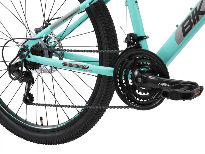 **Prima mountainbike** Zeer stabiel stalen frame voor dagelijks gebruik op de berg, in de stad of op school. Met een bandenmaat van 26 inch en framemaat 15 inch is hij geschikt voor jongens, meisjes of volwassenen van ca. 150 cm. Met het 21-speed Shimano derailleur-systeem met bijna naadloze schakeling kun je elke situatie aan. Mechanische schijfremmen aan de voor- en achterkant zorgen voor de nodige controle. De fiets heeft een geveerde voorvork met 55 mm veerweg.