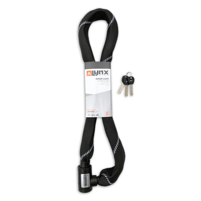 Dit Lynx kettingslot met het ART 2 keurmerk biedt de juiste bescherming voor de fiets tegen diefstal. De zachte, maar sterke flexibele mesh hoes voorkomt beschadigingen aan het frame van de fiets. Met een lengte van maar liefst 110 centimeter, perfect voor het vastleggen aan een vast object. Hierdoor is het slot ook uitstekend te gebruiken als tweede slot. De dikte van de vierkante schakels is 8.3 millimeter, gemaakt van gehard staal.