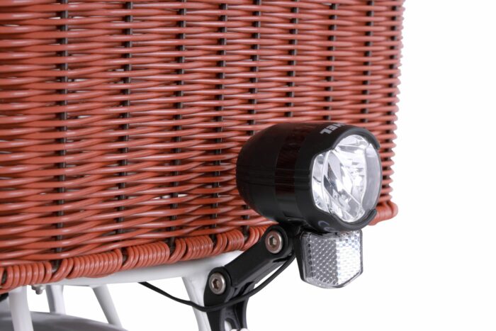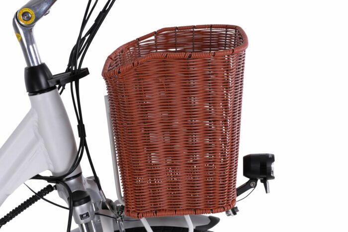 Zeer stijlvolle elektrische damesfiets, voorzien van kunstrieten mand op de voordrager. Deze luxe afgewerkte e-bike heeft een Shimano Nexus 7 versnellingsnaaf, een LCD display met 5 ondersteuningsstanden, Walk Assist, verlichting die werkt op de accu, een geveerde voorvork en een soepel gelzadel. De voorwielmotor wordt gevoed door een 10 Ah accu. De 10 Ah versie is er alleen in de kleur wit, maar daarvoor wel erg aantrekkelijk geprijsd. Heerlijk flaneren op de fiets, of even snel naar de stad voor een kopje koffie? Geen probleem! Dag in dag uit naar college of werk? Met plezier! Een hele zondag touren door de bossen? Kan allemaal!