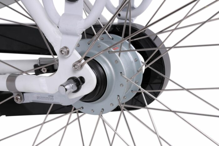 Aluminium luxe elektrische transportfiets, damesframe 50 cm, met Shimano Nexus 7 versnellingsnaaf, LCD display en 10Ah accu. Met mand. Wit