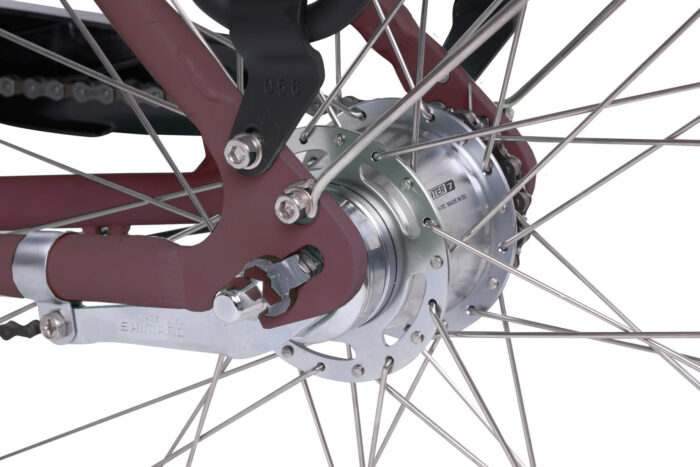 Aluminium stadsfiets, damesframe 50 cm, met Shimano Nexus 7 versnellingsnaaf, voorwielmotor, LCD display en 13Ah accu. Bordeauxrood