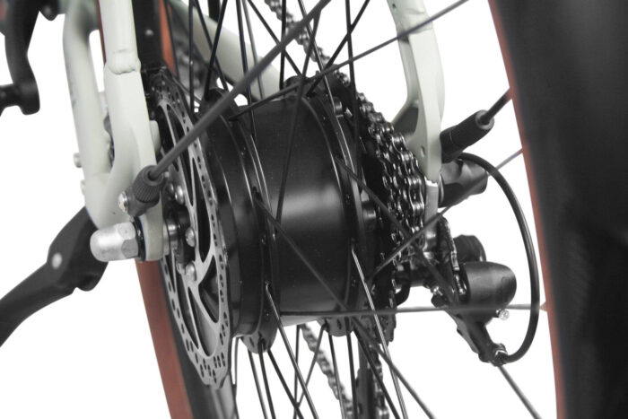 Elektrische herenfiets met achterwielmotor, geïntegreerde accu, schijfremmen, Shimano Tourney 21 versnellingen derailleur.