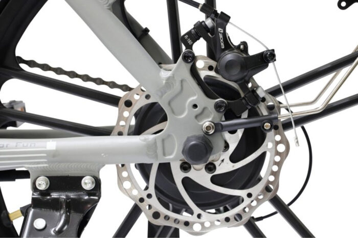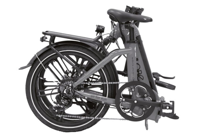 Elektrische vouwfiets met geïntegreerde accu, 10 Ah, schijfremmen, 7 versnellingen derailleur, geveerde vork, LCD display en verlichting. Grijs.