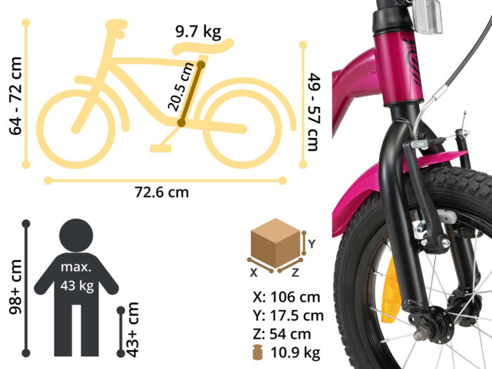 Voorwielrem met op kinderhandjes aangepaste, instelbare greep. Terugtraprem.