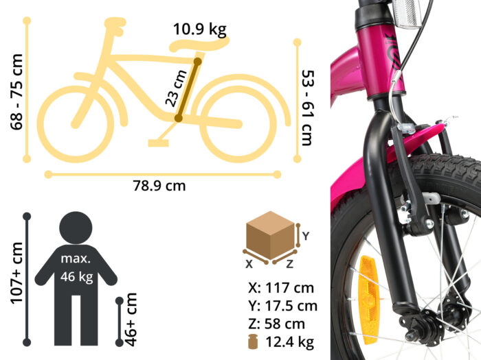 Voorwielrem met op kinderhandjes aangepaste, instelbare greep. Terugtraprem.