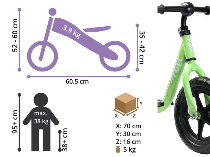 Lichtgewicht loopfiets met staplank en 12 inch antilek wielen. Om mee te steppen of te gebruiken als loopfiets. Leeftijd vanaf 3 jaar.