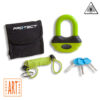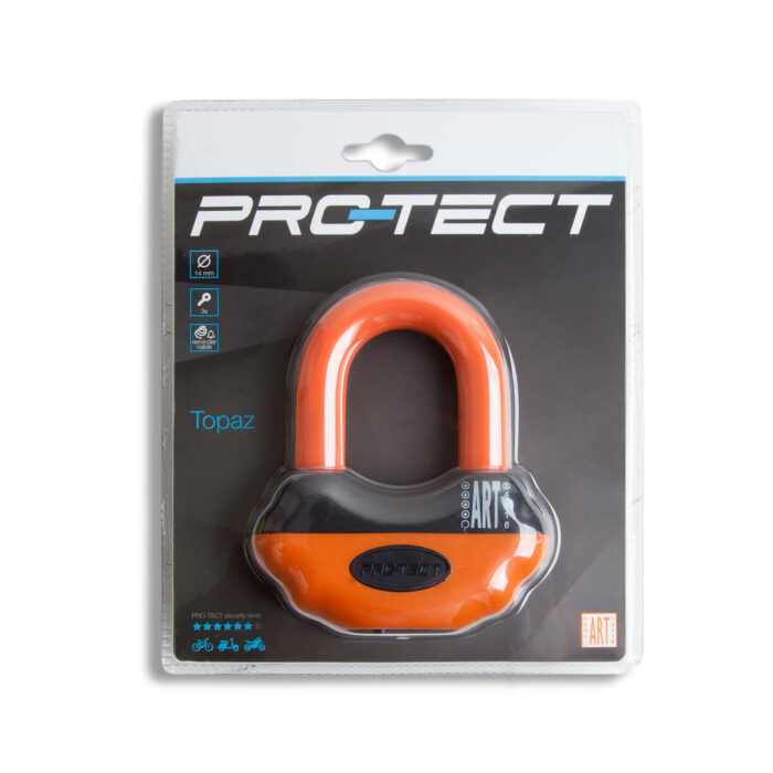 Pro-Tect Topaz ART-4 schijfremslot gemaakt van 14 mm U-beugel (17 mm inclusief beschermend omhulsel) van gehard staal en een versterkte cylinder tegen boren en inslag. Het slotplaatje beschermt de cylinder tegen stof en vocht. Wordt geleverd met reminder-kabel en tasje. Kleur oranje.