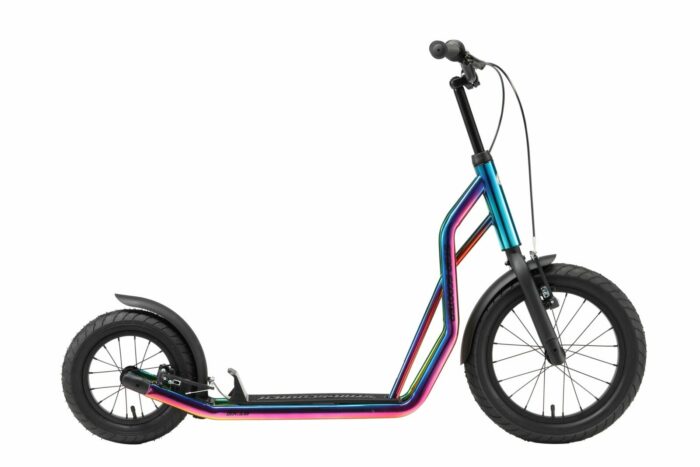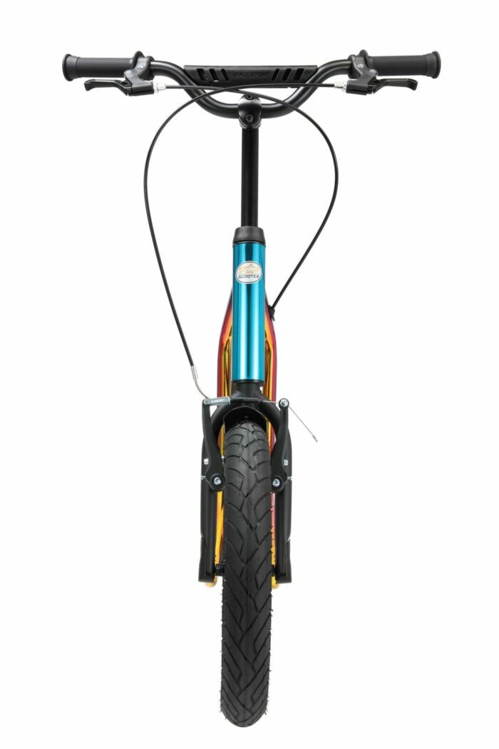 Zeer stabiel stalen buisframe met meerder slagvaste laklagen in diverse kleuren. Deze step voldoet aan alle normen en vereisten van de EU, stuurt licht, is duurzaam en gaat lang mee. De step is veilig, met gladde lasnaden. Dit model heeft een kindvriendelijke handrem voor extra veiligheid tijdens het spelen. Langdurig plezier gegarandeerd, met 16 inch luchtband voor en 12 inch achter.