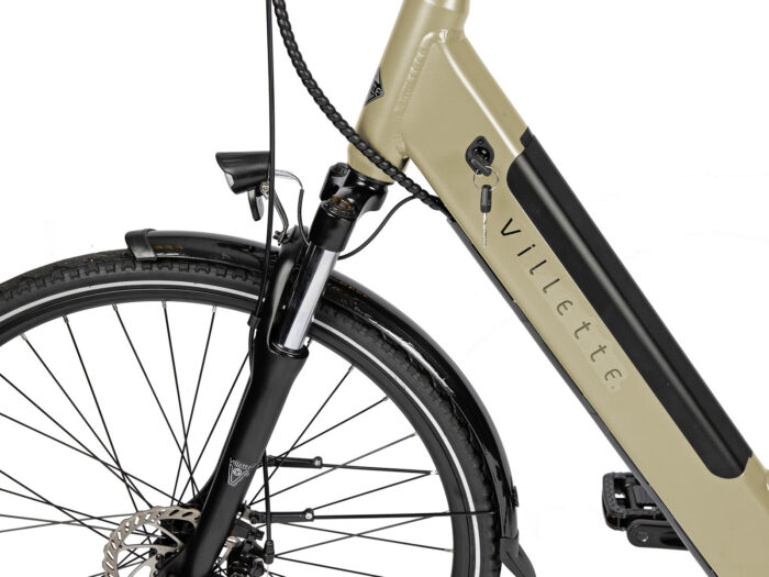 De automaat kiest welk van de twee versnellingen er gebruikt wordt, u bepaalt welke trapondersteuningsstand u gebruikt door deze op het LCD display bij uw linkerhand te selecteren. Het genieten kan direct beginnen. De geveerde voorvork vangt hobbels in het wegdek op, net als het comfortabele zadel. Met de Villette l’ Amant heeft u een goed uitgeruste elektrische fiets in handen. Veel waar voor uw geld, een e-bike waarmee het heerlijk toeren is, maar die ook geschikt is voor ritjes naar de stad of voor woon-werk verkeer. (De fiets wordt zonder slot geleverd, wij raden u aan een ART gekeurd slot aan te schaffen).