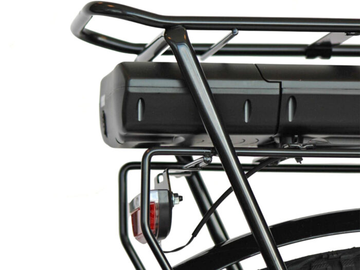Elektrische damesfiets met 7.8 Ah accu, achterwielmotor, 7 versnellingen, schijfremmen en 26 inch wielen.