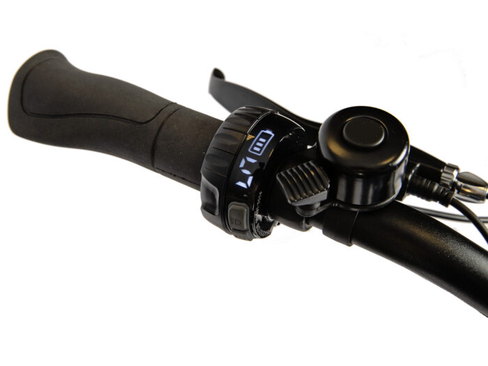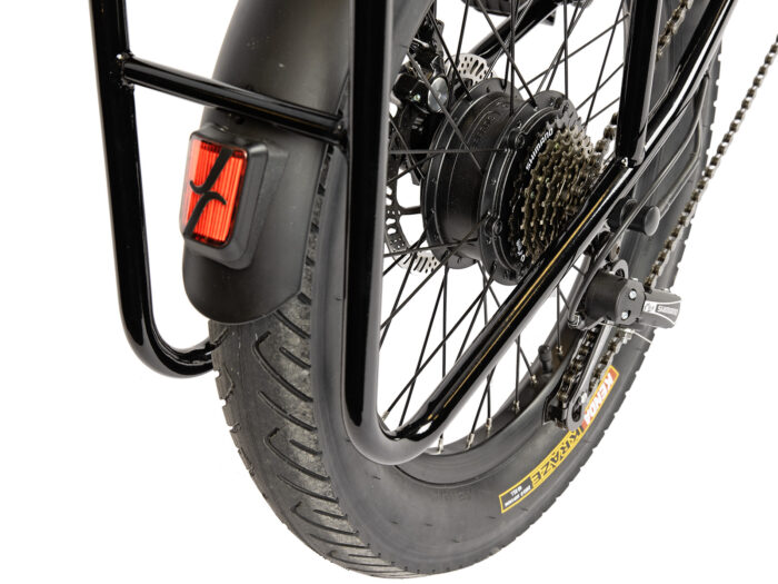 Elektrische vouwfiets met 3 inch dikke banden, 10,4 Ah accu aan de stevige aangelaste bagagedrager, schijfremmen en 7 versnellingen derailleur.